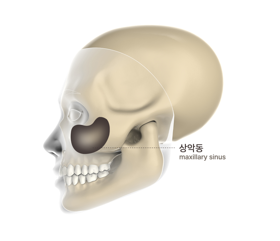 사람의 얼굴 뼈, 양 볼 안쪽에 있는 빈 공간으로 소리의 공명을 일으키며 공기의 노폐물과 먼지를 걸러내고 두개골의 무게를 줄여주는 역할을 합니다. 위턱 어금니 부위에 임플란트 시 치조골량이 부족한 것이 대부분인데 이는 상악동의 빈 공간 때문입니다. 상악동은 얇은 미세한 막으로 둘러싸여 있는데 이 막을 들어 올린 후 그 부위에 치조골을 이식하여 임플란트를 심을 바탕을 마련해 주는데, 이러한 수술을 상악동 수술을 동반한 임플란트라고 표현합니다.