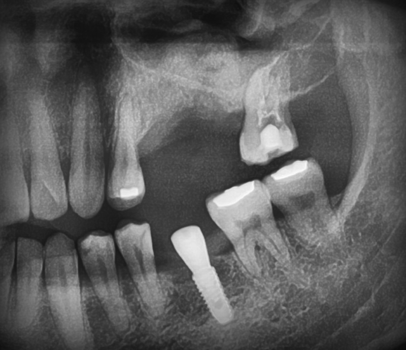 발치한 뒤 오랜 시간이 지나면 치조골이 흡수되어 없어집니다. 특히 바깥 부분이 빠르게 없어지는 것은 20번대 고수치부CT에서 확인할 수 있었습니다. 이 부위는 폭이 5.2mm밖에 남아있지 않아 3.5mm 정도 또는 인공 치조골을 이식하여 4.0mm 정도의 임플란트를 식립할 수 있었습니다. 소실된 우측 송곳니와 소구치 사이에서 두꺼운 치조골 부위는 찾아 의도적으로 방향을 꺾어 임플란트를 식립하기로 계획하였으며 사진은 수술 후 6개월 뒤 보철을 올려 마무리된 파노라마입니다.
