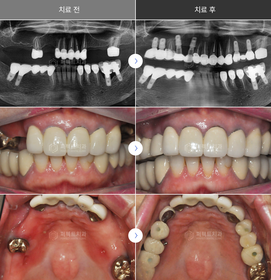 세 부위에 수술이 필요할 것으로 보이고, 상악 우측은 임플란트를 심기에는 치조골의 양이 너무 적어서 상악동 내부 뼈이식이 필요했습니다.