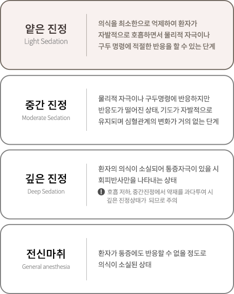 얕은 진정Light Sedation | | 의식을 최소한으로 억제하여 환자가 자발적으로 호흡하면서 |